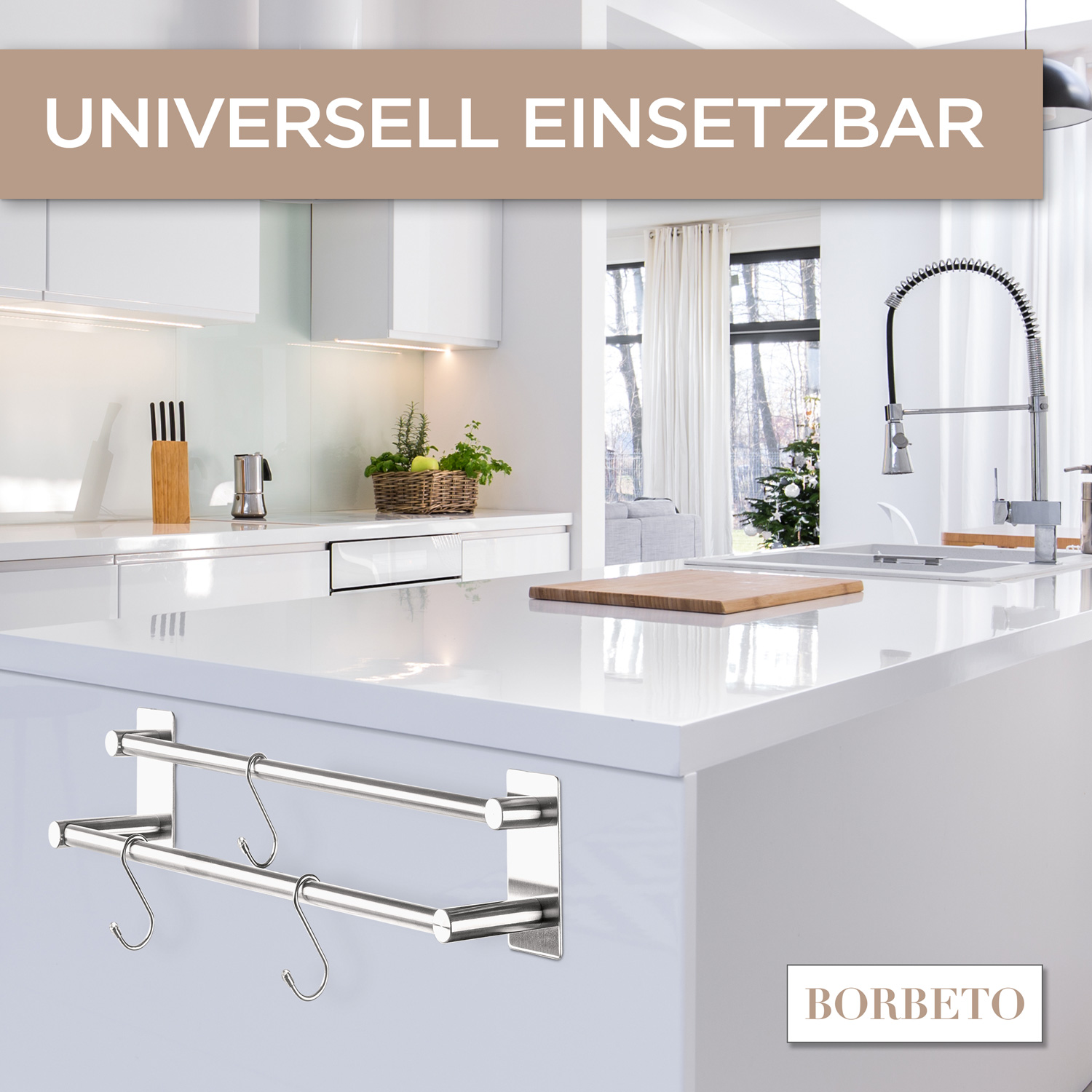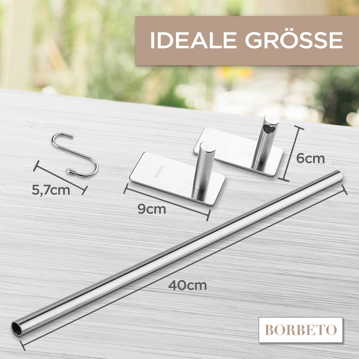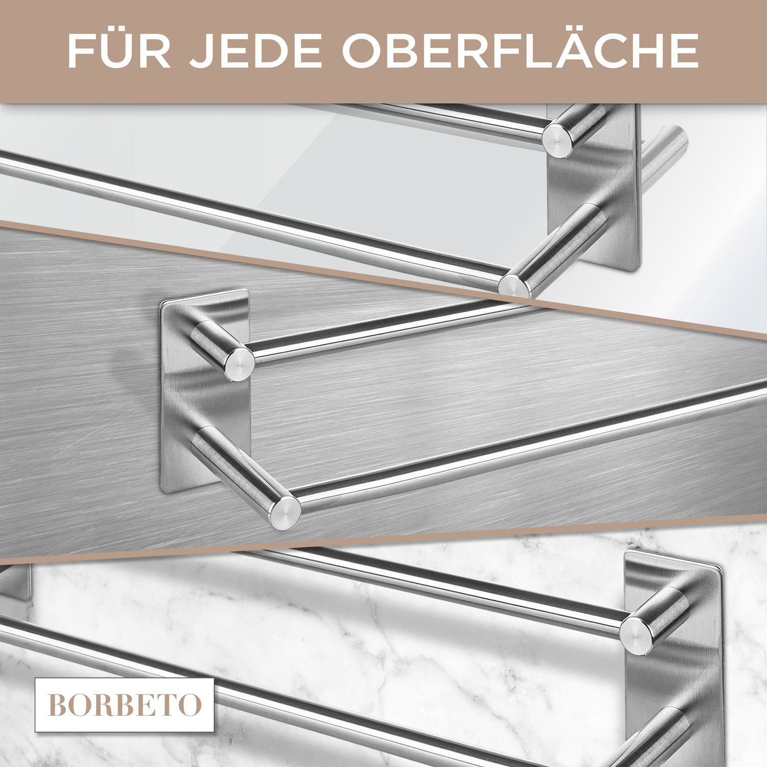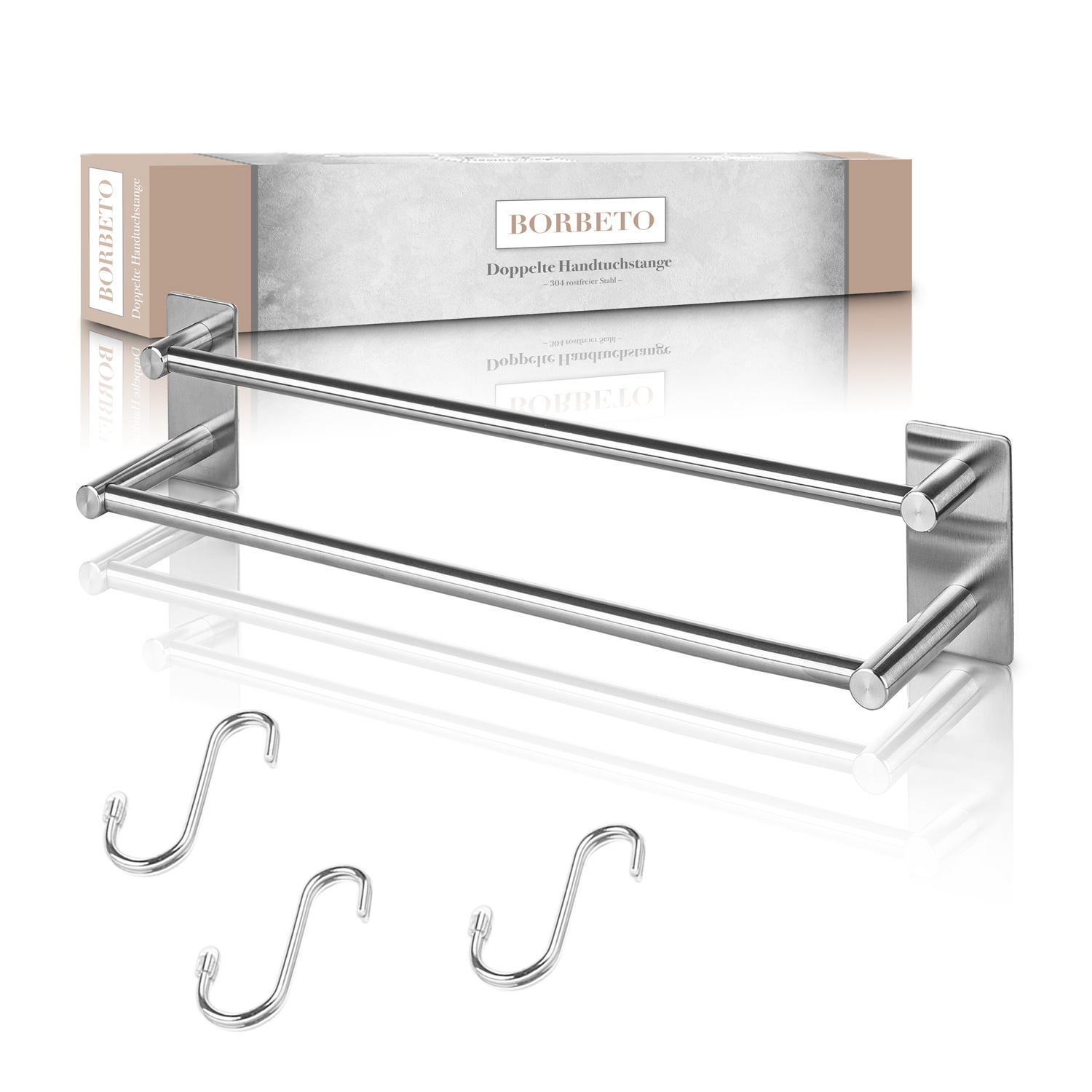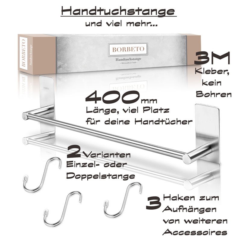 Deine BORBETO Handtuchstange wird ohne Bohren, mit dem bewehrten 3M Kleber, einfach an jeden Untergrund montiert. Die drei mitgelieferten Haken ermöglichen es dir, weitere Badutensilien an die Stange zu hängen, so wie zum Beispiel einen Waschlappen, Bürste, kleines Handtuch oder vieles mehr.